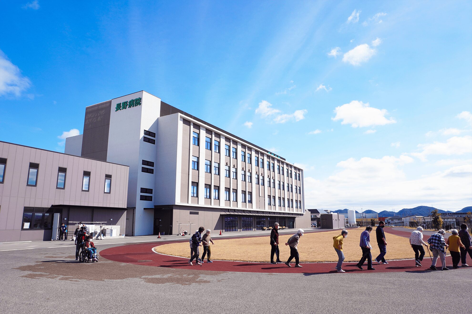 当院は2023年に創業75周年をむかえ、同年8月に新築移転いたしました。新しい病棟では、これまでの施設に加え、リハビリ用の大きな屋外グラウンドと屋内リハビリ室を有し、ADL(日常生活動作)向上や在宅復帰のための医療を提供いたします。災害時に地域の拠点病院としての機能も備え、感染症対策として別棟に発熱者対応エリアも確保しております。