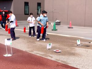 初期消火訓練では、水の入った消火器を使用し、使い方の説明を受けた後、実際にパネルに向かって消火器の操作を体験しました。